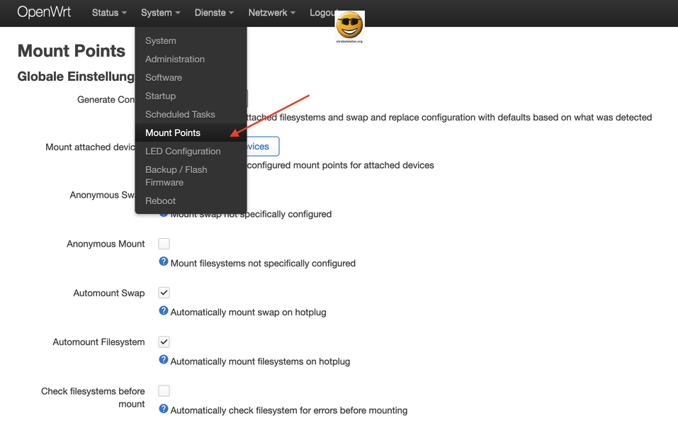 After the installation a new menu appears System --> Mount Points. If the menu is not displayed just reboot OpenWrt.