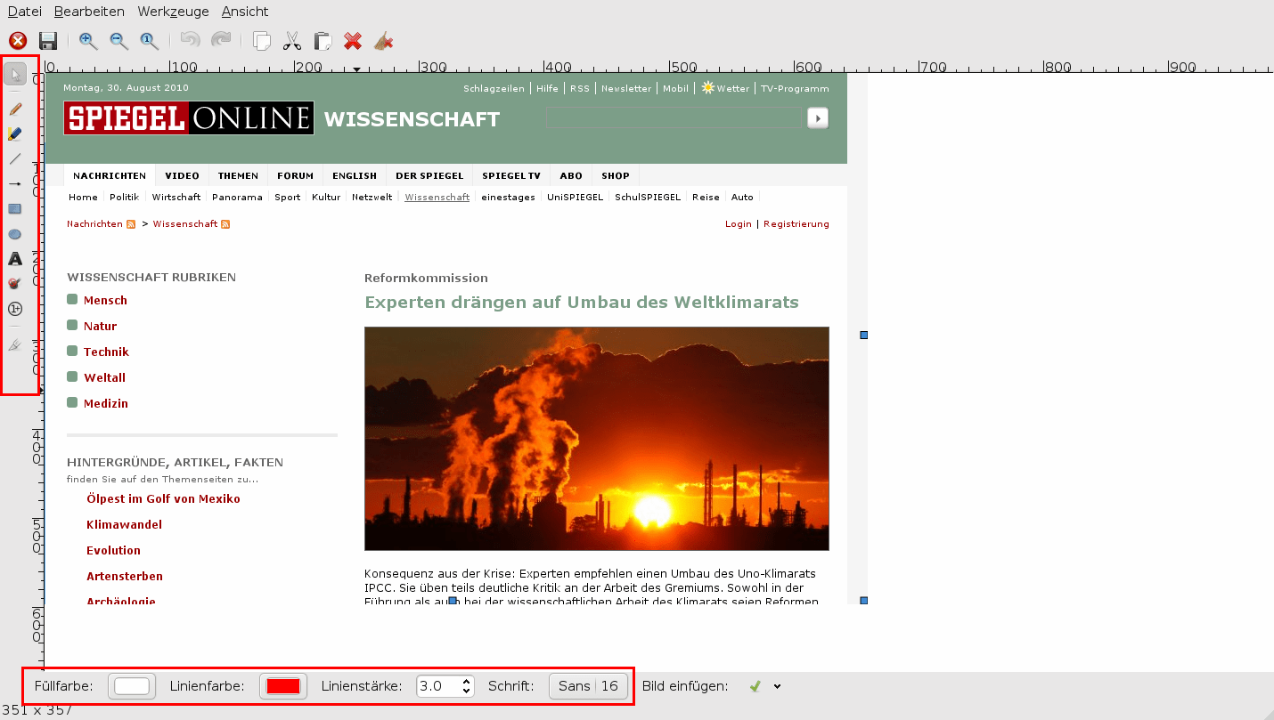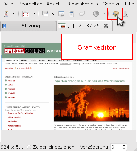 Möchte man seine Screenshots mit Pfeilen, Rechtecken, Test, Mauszeigern, und anderen Icons versehen, braucht man das eingebaute Bildbearbeitungsprogramm. Der grafische Bildbearbeitungseditor lässt sich bequem über die Menüleiste von Shutter starten.