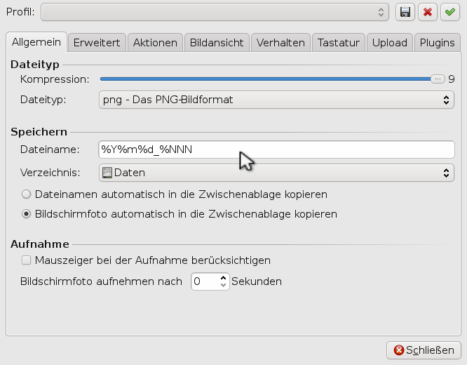 Die bearbeiteten Bilder werden von Shutter automatisch an einem zuvor definierten Ort auf der Platte abgespeichert. In den Einstellungen lässt sich sehr leicht definieren, in welchen Format und mit welcher Bezeichnung das Tool die Bilder speichern soll. Fahrt einfach mit der Maus auf das Feld "Dateiname" und Shutter bietet euch paar Möglichkeiten für die Namensgebung der Bilder