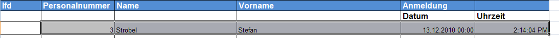 Nun könnte man mit dem Ergebnis zufrieden sein. Die Anmeldung war erfolgreich und die Werte (Nachname, Vorname, Personalnummer, Datum, Uhrzeit) wurden in die Zellen in der Tabelle "Verant" geschrieben.