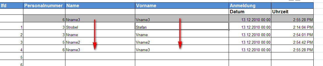 Schaut man sich den Screenshot an, wird einem das Prinzip klar. Alle neu eingegebenen Werte werden in die Zeile 8 geschrieben und sofort in die nächstmögliche frei Zeile kopiert. Meldet man sich also noch ein paar mal an, dann passiert folgendes