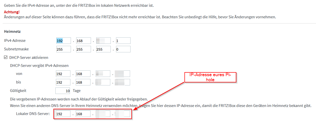 Auf der FRITZ!Box ist in "Netzwerk → Netzwerkeinstellungen → IPv4-Adressen" die IP-Adresse des Pi-hole einzutragen.