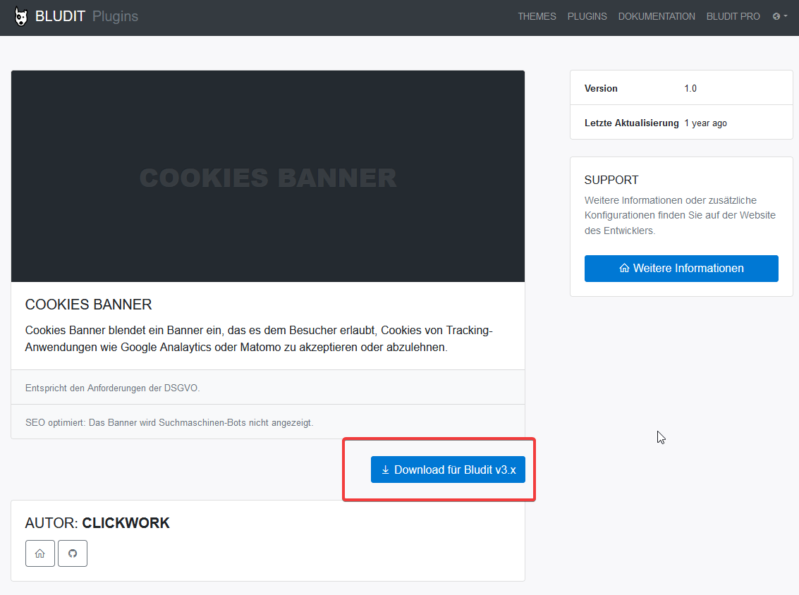 Am Beispiel der Erweiterung "Cookie Banner" spielen wir das Vorgehen mal durch.