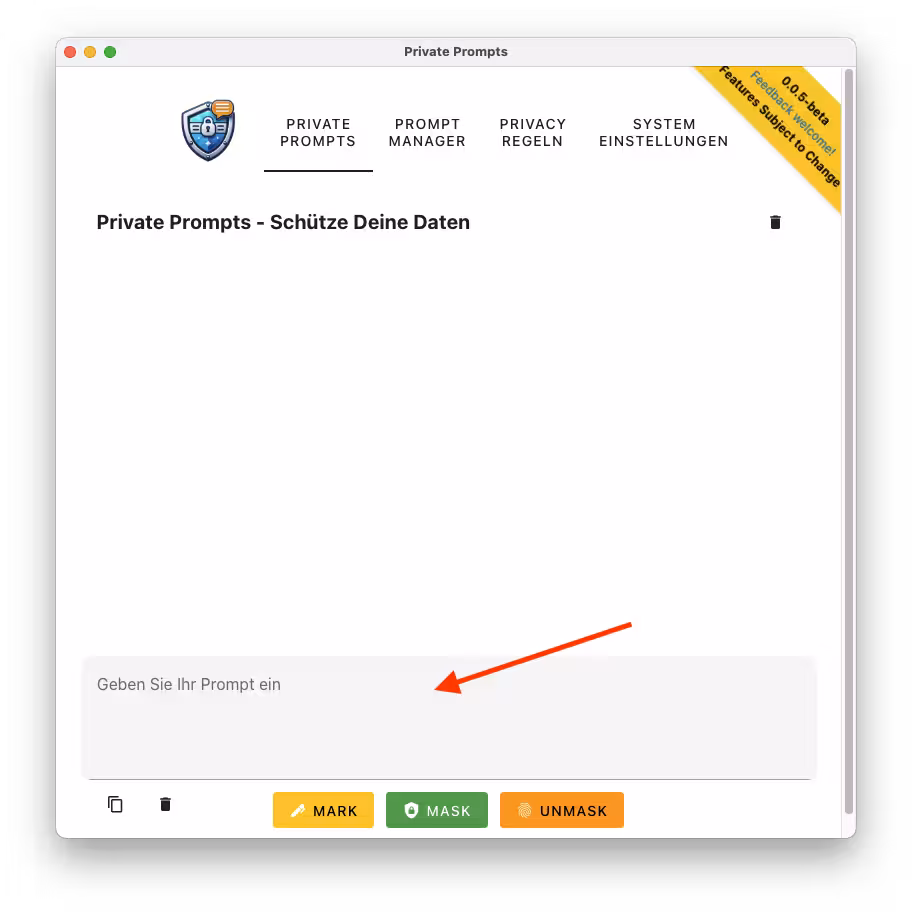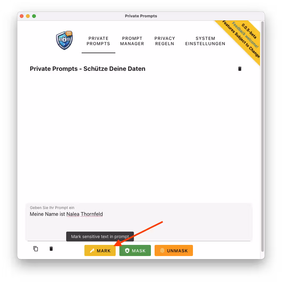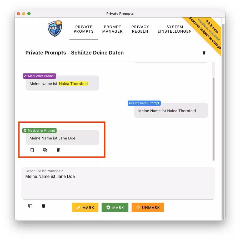 Private Prompts () ist ein Tool, dass sensible Daten auf dem eigenen Client in einem Prompt entfernen (MARK und MASK) und durch fiktive Informationen ersetzen kann. Anschließend kann der "neue" Prompt über die Zwischenablage in die KI der Wahl eingefügt werden.
