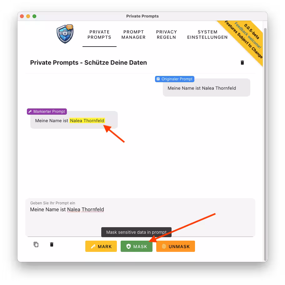 Mit einem Klick auf MASK ersetzt Private Prompts die sensiblen Daten mit den Informationen, die im Reiter PRIVACY REGELN festgelegt wurden.